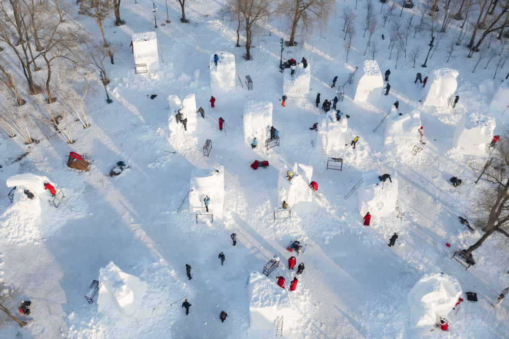 2025年1月6日,第27屆哈爾濱國際雪雕比賽參賽選手在雕刻雪雕作品。來自10個國家20余支代表隊的雪雕藝術(shù)家在哈爾濱太陽島雪博會園區(qū)同場競技。