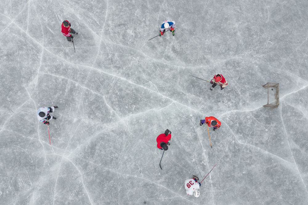 2025年1月7日,冰球愛好者在哈爾濱丁香公園的冰面上打冰球。