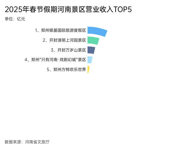 河南省文旅廳數(shù)據(jù)顯示,春節(jié)假期八天,全省營(yíng)收上億元的景區(qū)僅有兩家,分別是鄭州銀基國(guó)際旅游度假區(qū)1.43億元,開(kāi)封清明上河園景區(qū)1.03億元。
