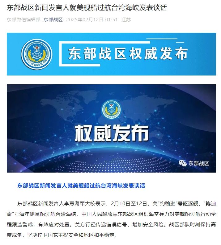 東部戰(zhàn)區(qū)新聞發(fā)言人李熹海軍大校表示,2月10日至12日,美“約翰遜”號驅逐艦、“鮑迪奇”號海洋測量船過航臺灣海峽。中國人民解放軍東部戰(zhàn)區(qū)組織??毡γ琅灤^航行動全程跟監(jiān)警戒,有效應對處置。美方行徑傳遞錯誤信號、增加安全風險。戰(zhàn)區(qū)部隊時刻保持高度戒備,堅決捍衛(wèi)國家主權安全和地區(qū)和平穩(wěn)定。