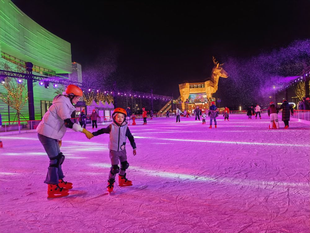 在上海徐匯濱江,“樂滑之夢”和西岸夢中心聯(lián)手打造的戶外水岸冰場熱鬧非凡。伴隨節(jié)奏感強的音樂和靈動燈光,上海市民周雄和兒子手牽手,在冰面上練習(xí)滑行。