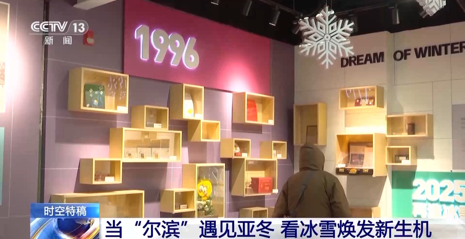 總臺央視記者 鄭怡哲:看完了亞布力的絕美雪景和熱鬧非凡的雪場,讓我們回到哈爾濱的市區(qū)來看一看。那要說什么地方最能體現(xiàn)黑龍江哈爾濱兩屆亞冬會城市這一端的變化,那一定是這個雙亞冬的紀(jì)念館,其實我覺得從紀(jì)念品上就能看出這個城市的特點和發(fā)展脈絡(luò)。