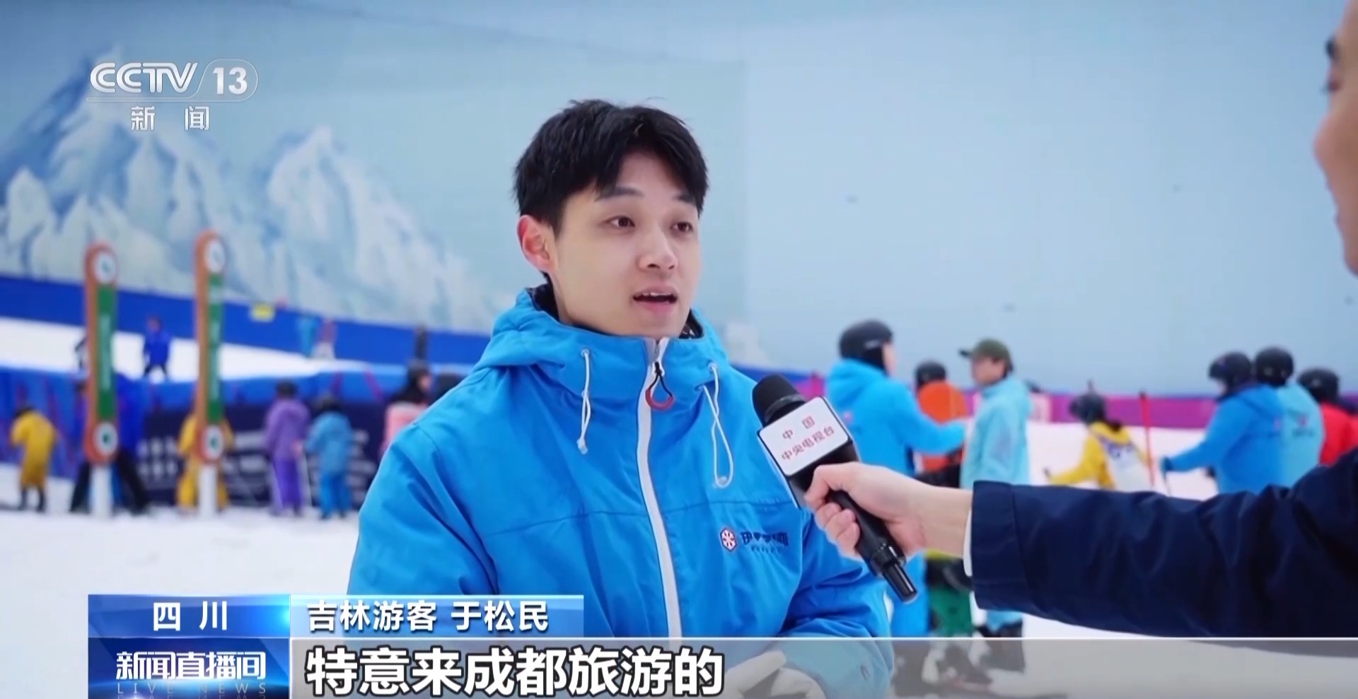 吉林游客 于松民:我是從吉林來的,特意來成都旅游的。然后就想特意體驗(yàn)一下成都市內(nèi)的滑雪場,沒有想到今天在這兒看到這么大的一個(gè)滑雪場。