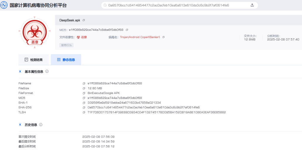 近日,國家計算機病毒應急處理中心和計算機病毒防治技術國家工程實驗室依托國家計算機病毒協(xié)同分析平臺(virus.cverc.org.cn)在我國境內(nèi)捕獲發(fā)現(xiàn)針對我國用戶的仿冒我國國產(chǎn)人工智能大模型“DeepSeek”官方APP的安卓平臺手機木馬病毒,如圖1、圖2所示。
