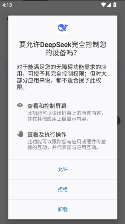 用戶一旦點擊運行仿冒APP,該APP會提示用戶“需要應用程序更新”,并誘導用戶點擊“更新”按鈕。用戶點擊后,會提示安裝所謂的“新版”DeepSeek應用程序,實際上是包含惡意代碼的子安裝包,并會誘導用戶授予其后臺運行和使用無障礙服務的權限,如圖3至圖6所示。