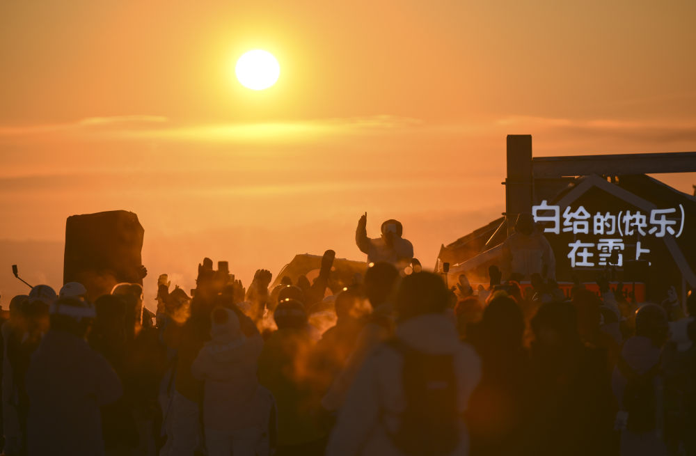 落日余暉灑在阿勒泰市將軍山國際滑雪度假區(qū)的山頂,漫山白雪被染成橙粉色。在現(xiàn)場電子音樂強(qiáng)勁的鼓點(diǎn)中,上千名滑雪愛好者歡呼搖擺,在零下十幾度的雪地里感受“蹦雪迪”的歡快。