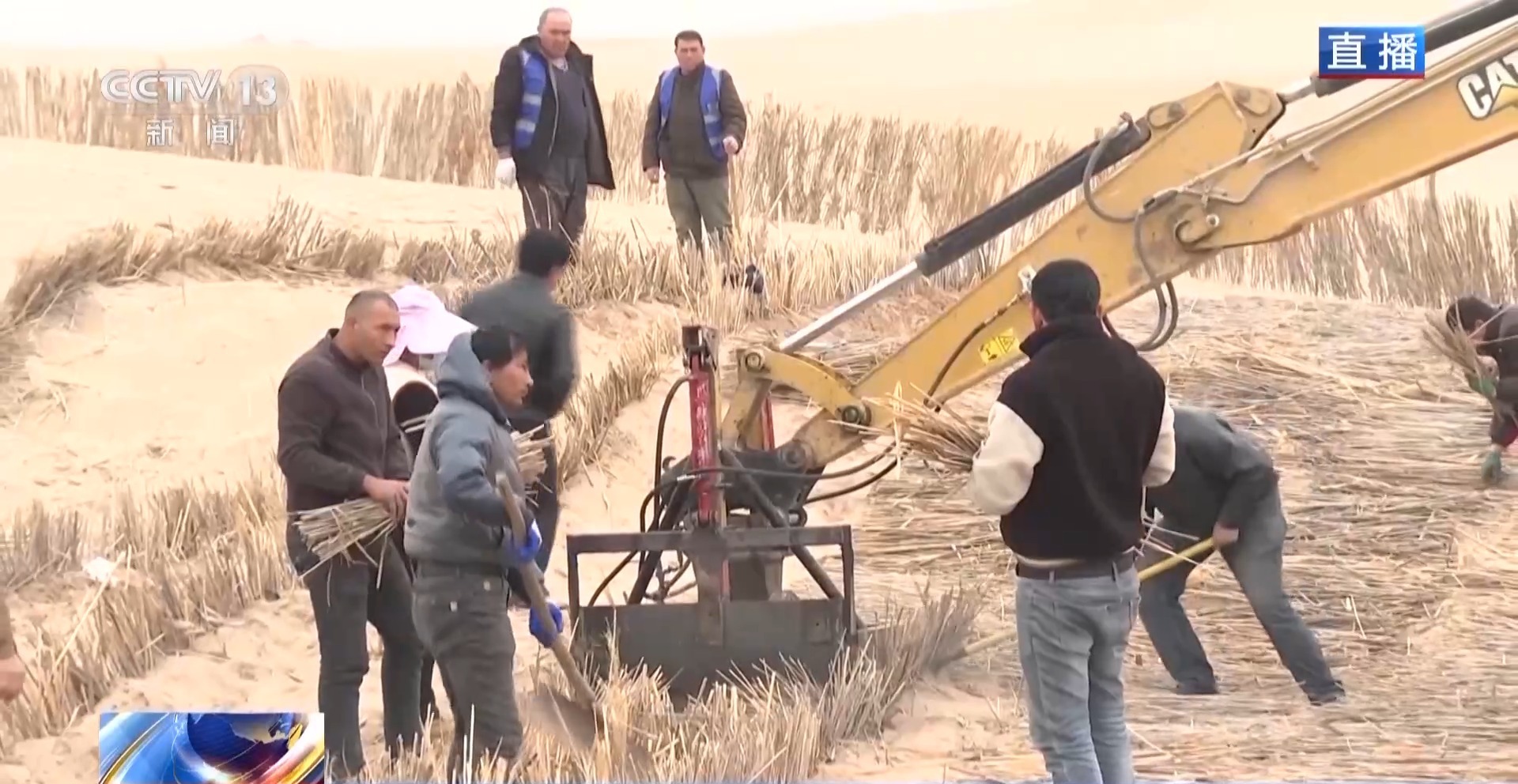 總臺(tái)記者從新疆巴楚縣阿克薩克馬熱勒鄉(xiāng)防沙治沙工程施工現(xiàn)場(chǎng)發(fā)回報(bào)道。當(dāng)?shù)氐?00多名各族干部群眾人工鋪設(shè)“草方格”,也就是將干蘆葦鋪設(shè)在地面,再壓進(jìn)沙土中,它的主要作用是固沙。