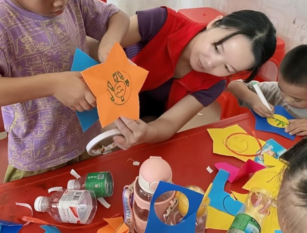 廣西南寧市武鳴區(qū)“愛心媽媽”志愿服務隊隊員與孩子一同做手工。新華社發(fā)
