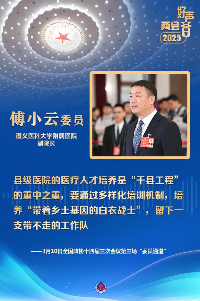 “國家持續(xù)實施‘千縣工程’,開展醫(yī)療人才‘組團(tuán)式’支援幫扶,支援西藏、新疆、青海等地區(qū)醫(yī)院和國家鄉(xiāng)村振興重點幫扶縣人民醫(yī)院?!弊窳x醫(yī)科大學(xué)附屬醫(yī)院副院長傅小云委員說。