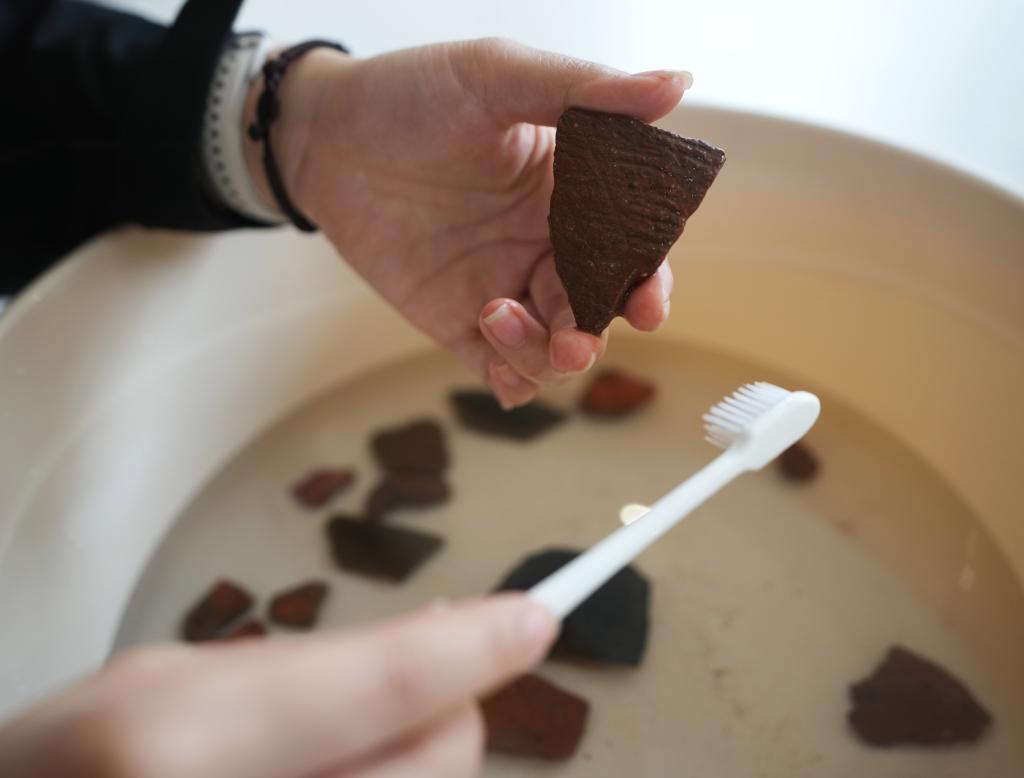 3月11日,在遼寧省朝陽市北票市的考古人員住所,考古人員在清洗調查現(xiàn)場發(fā)現(xiàn)的碎陶片。當日,來自遼寧省文物考古研究院的考古人員在遼寧省朝陽市雙塔區(qū)調查紅山文化遺址。此前,考古人員在遼寧省朝陽市凌源無白丁遺址群新發(fā)現(xiàn)多處紅山文化遺跡。新華社記者 李鋼 攝