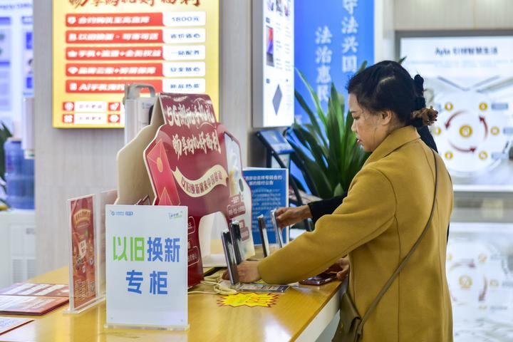 2月21日,在廣西東興市一家手機(jī)賣(mài)場(chǎng),消費(fèi)者在查看手機(jī)以舊換新的機(jī)型。新華社記者 曹祎銘 攝