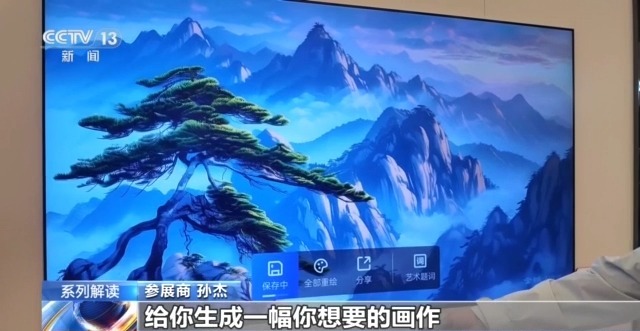 參展商 孫杰:只要說(shuō)出你想要的畫(huà)面內(nèi)容,它就會(huì)很短的時(shí)間給你生出一幅你想要的畫(huà)作。既可以作為自己的畫(huà)作在電視上欣賞,也可以通過(guò)微信掃碼復(fù)制到電腦手機(jī)上作為桌面。