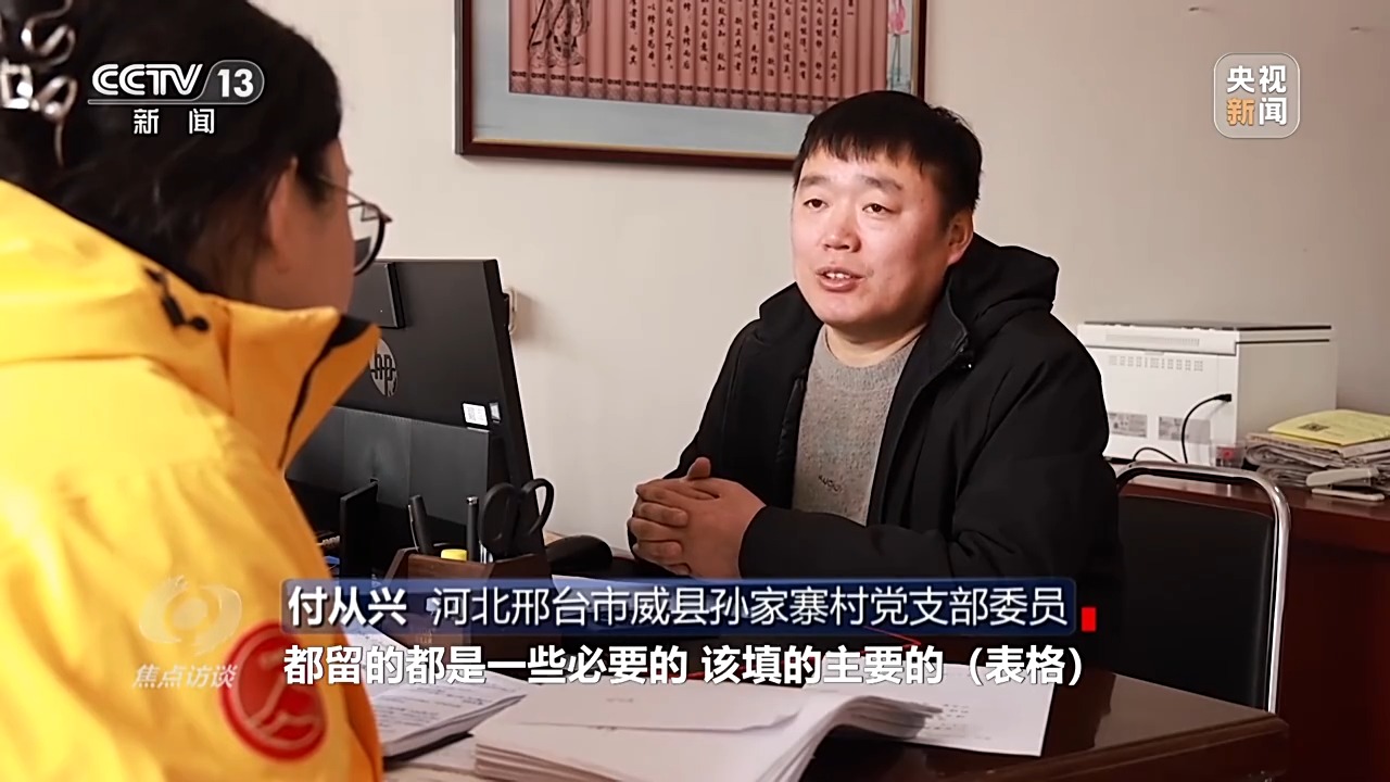 河北邢臺(tái)市威縣孫家寨村黨支部委員 付從興:現(xiàn)在各個(gè)部門表格減少了,都留的都是一些必要的、該填的主要的表格,我感覺這樣很好,很精簡(jiǎn),入戶有更多精力去給人家探索這些事情,人家家里確實(shí)發(fā)生什么困難,有多少收入,咱們的政策怎么能幫助人家。