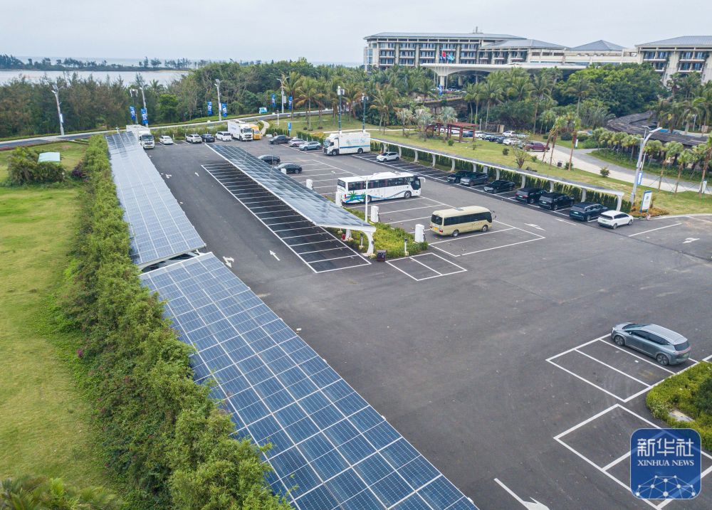 ↑ 在博鰲零碳示范區(qū)拍攝的建有光伏發(fā)電設(shè)備的停車場(chǎng)(無人機(jī)照片,3月16日攝)。
