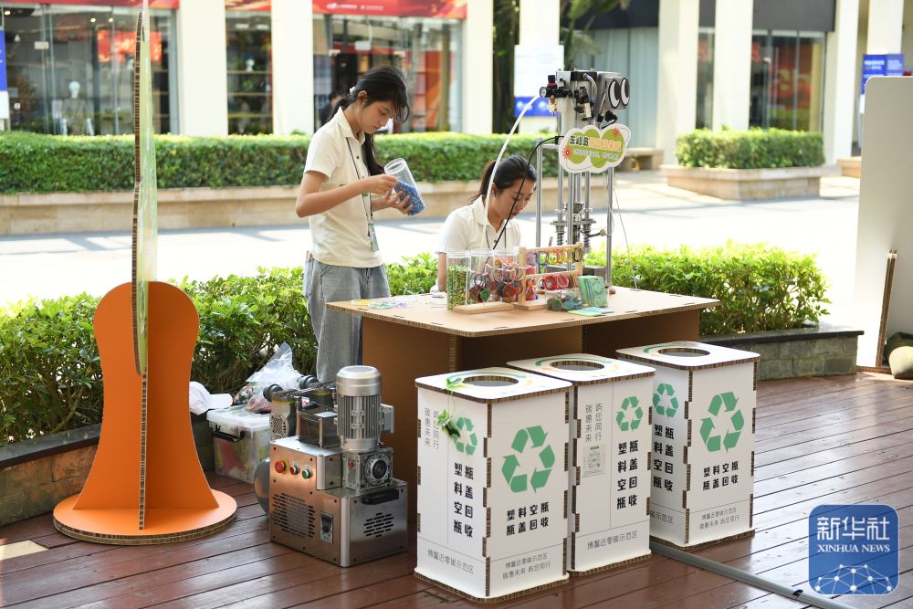 ↑ 這是在博鰲零碳示范區(qū)內(nèi)的塑料再生流程科普展臺(tái)上,工作人員演示塑料再生流程(3月25日攝)。