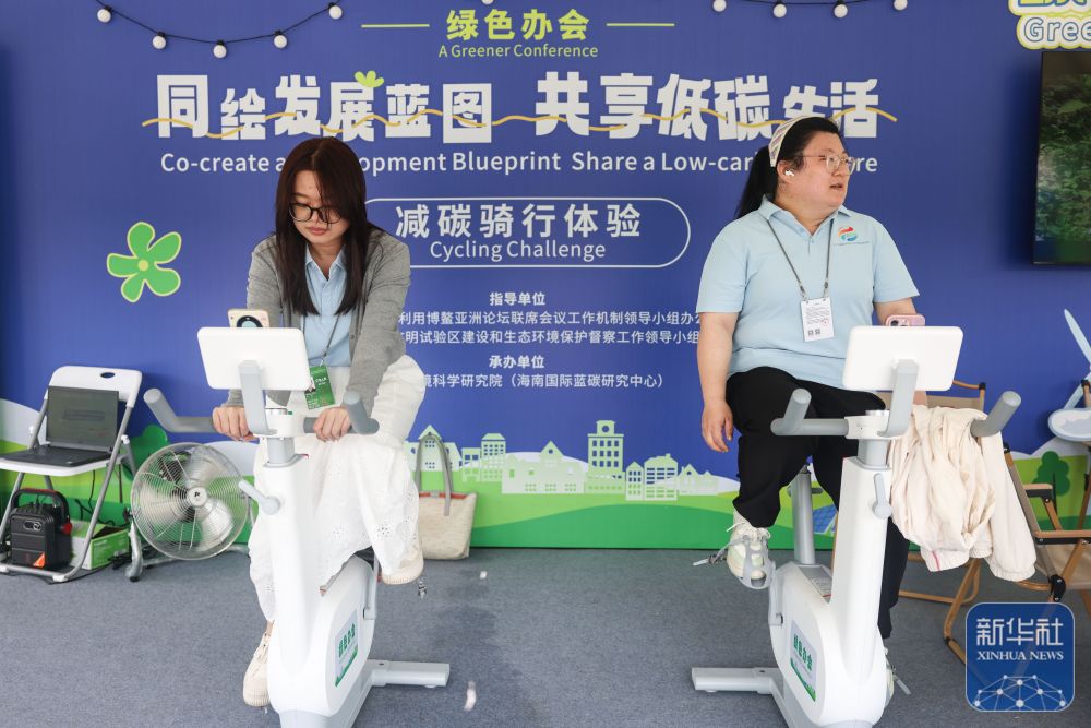 ↑ 3月25日,參會(huì)人員在博鰲東嶼島文化公園內(nèi)體驗(yàn)減碳騎行活動(dòng)。