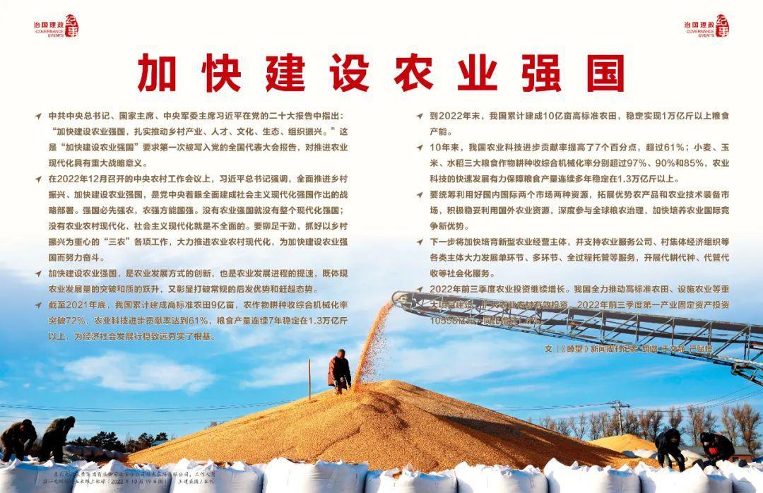 中共中央總書記、國家主席、中央軍委主席習(xí)近平在黨的二十大報告中指出:“加快建設(shè)農(nóng)業(yè)強國,扎實推動鄉(xiāng)村產(chǎn)業(yè)、人才、文化、生態(tài)、組織振興。”這是“加快建設(shè)農(nóng)業(yè)強國”要求第一次被寫入黨的全國代表大會報告,對推進農(nóng)業(yè)現(xiàn)代化具有重大戰(zhàn)略意義。