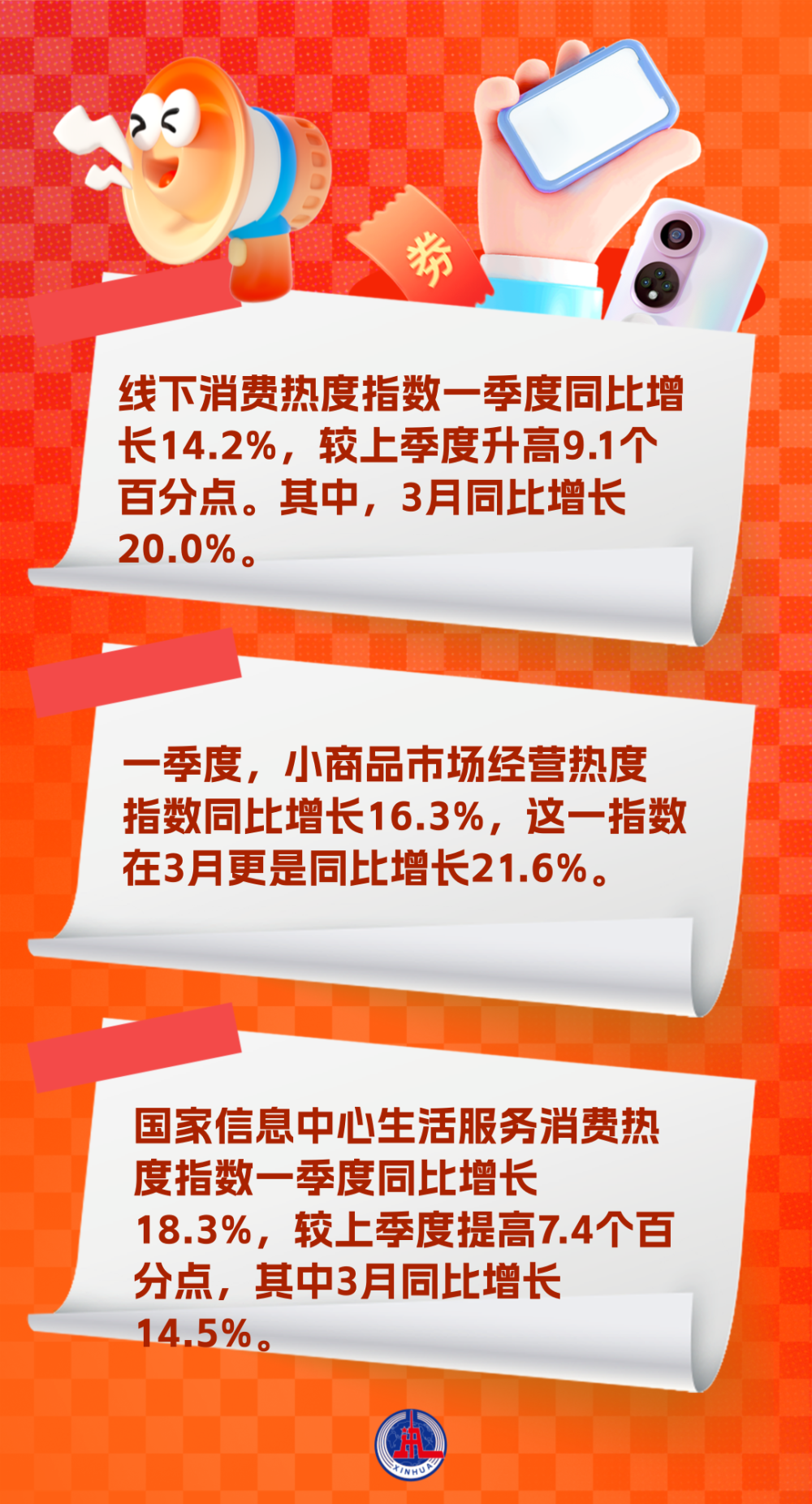 數(shù)據(jù)顯示,一季度,我國消費市場亮點紛呈,呈現(xiàn)向好態(tài)勢。從線下消費來看,國家信息中心線下消費熱度指數(shù)一季度同比增長14.2%,較上季度升高9.1個百分點。其中,3月同比增長20.0%,比前兩個月高出4.7個百分點,增速持續(xù)攀升。