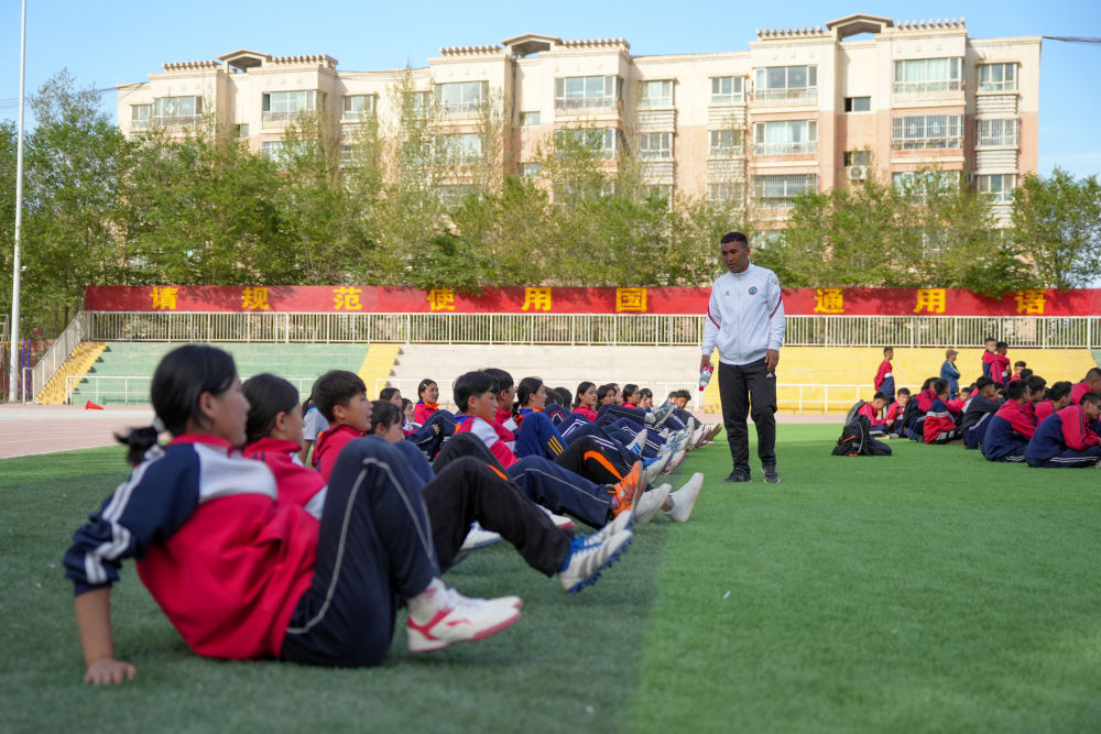 ↑4月10日,在阿圖什市硝魯克中學,隊員們在教練如扎吉的指導下進行訓練。新華社記者 徐宏巖 攝