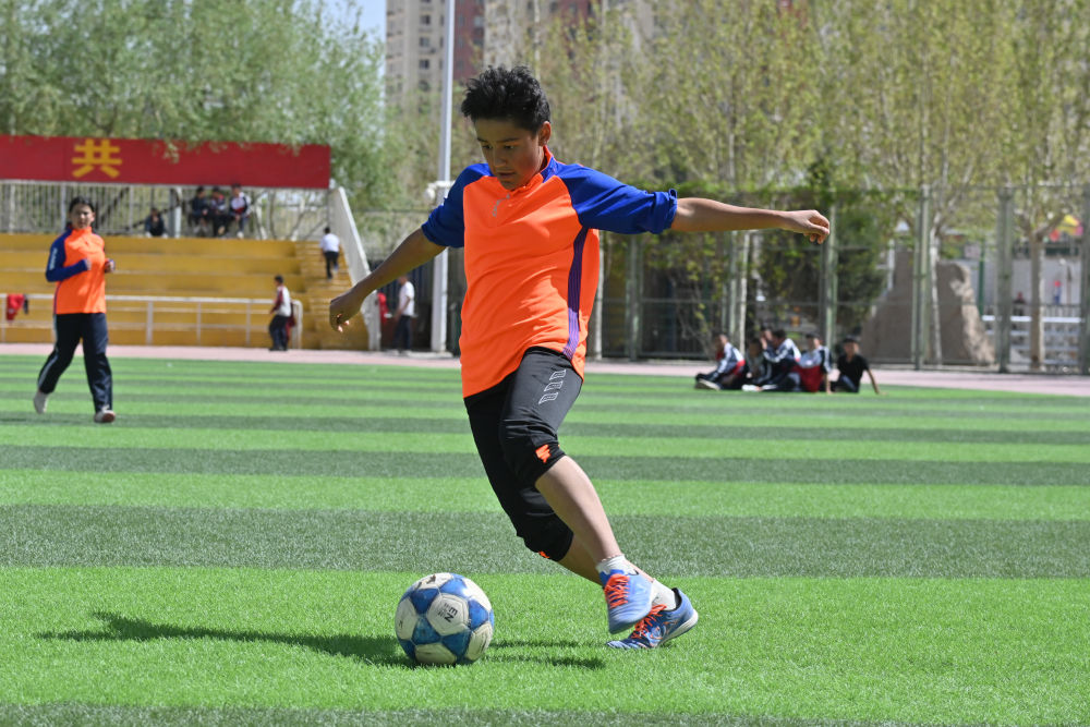 ↑在阿圖什市硝魯克中學,球隊前鋒謝爾克努爾·亞力坤在訓練賽中帶球進攻。新華社記者 徐宏巖 攝
