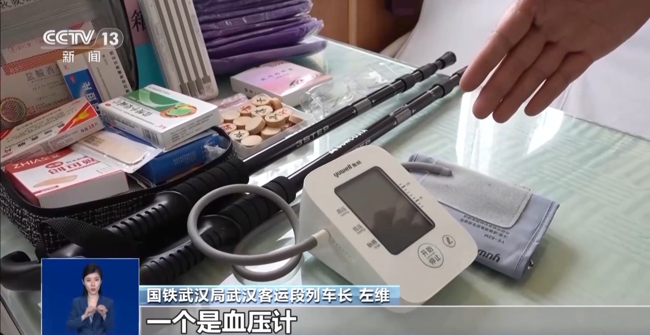 國鐵武漢局武漢客運(yùn)段列車長 左維:我們列車提供了以下這些物品:血壓計(jì)、老年人經(jīng)常使用基礎(chǔ)藥包,在車廂里面還設(shè)置了無障礙廁所,早上還提供軟食,老年旅客更容易消化吸收。