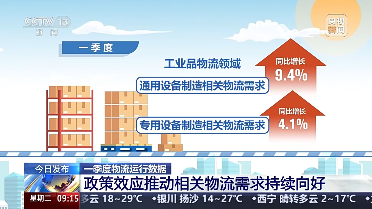 政策效應(yīng)持續(xù)顯現(xiàn),大規(guī)模設(shè)備更新、消費(fèi)品以舊換新政策推動(dòng)相關(guān)物流需求持續(xù)向好。一季度,工業(yè)品物流領(lǐng)域的通用設(shè)備、專用設(shè)備制造相關(guān)物流需求,同比分別增長(zhǎng)9.4%、4.1%;民生消費(fèi)領(lǐng)域的通信器材類、家用電器和音像器材類、家具類商品零售相關(guān)物流需求同比分別增長(zhǎng)26.9%、19.3%和18.1%。