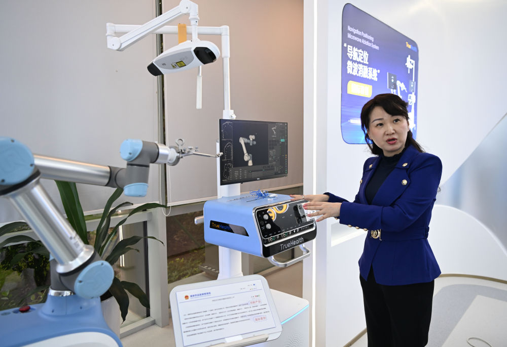澳門企業(yè)真健康(廣東橫琴)醫(yī)療科技有限公司創(chuàng)始人張昊任在介紹“導(dǎo)航定位微波消融系統(tǒng)”(2024年11月24日攝)。新華社記者 鄧華 攝
