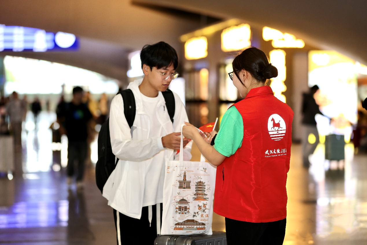 志愿者在武漢站為游客送上文旅大禮包