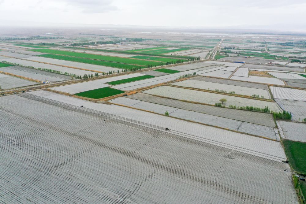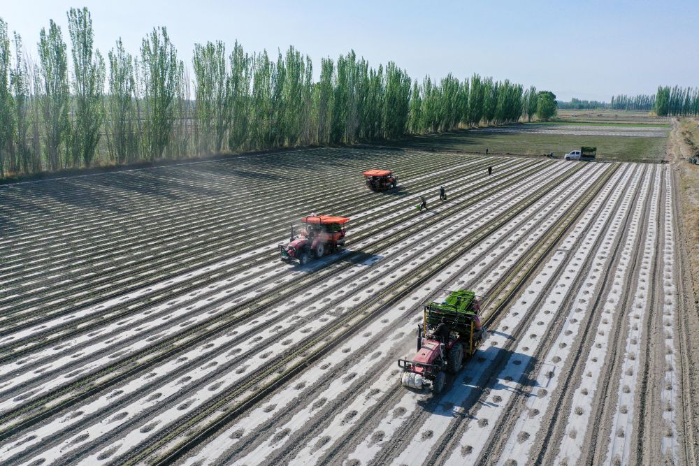 在新疆巴音郭楞蒙古自治州焉耆回族自治縣四十里城子鎮(zhèn),農(nóng)戶操作移栽機在農(nóng)田里移栽番茄苗(4月26日攝,無人機照片)。新華社記者丁磊 攝