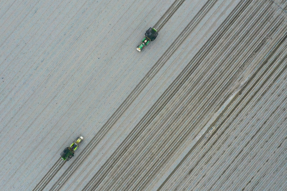 在新疆巴音郭楞蒙古自治州博湖縣本布圖鎮(zhèn),農(nóng)戶操作移栽機在農(nóng)田里移栽辣椒苗(4月28日攝,無人機照片)。新華社記者丁磊 攝