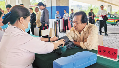 “您這血壓有點(diǎn)高,‘五一’假期活多,別忘了吃藥。”“記住啦,謝謝。”51歲的司機(jī)楊建民在門口的義診攤位量完血壓,整理著衣袖。
