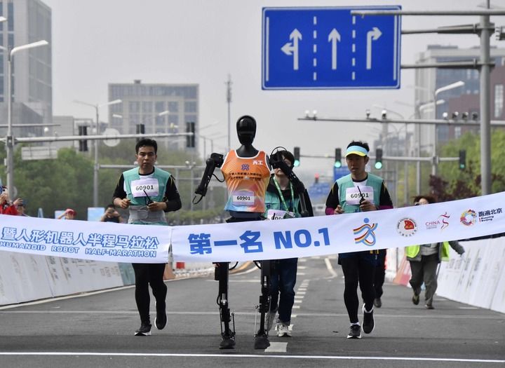 2025年4月19日,在北京亦莊舉行的2025北京亦莊半程馬拉松暨人形機器人半程馬拉松比賽上,天工隊選手天工Ultra(左二)沖向終點。