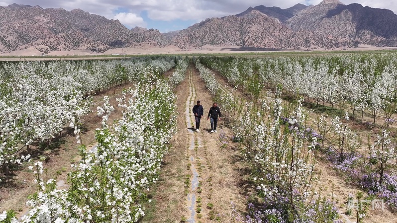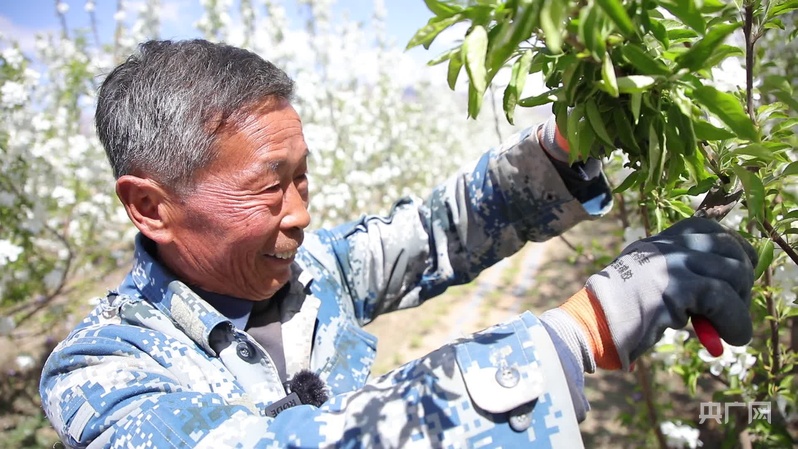 步入內(nèi)蒙古巴彥淖爾市烏拉特前旗白彥花鎮(zhèn)塔漢其嘎查林果產(chǎn)業(yè)園,大片果樹迎來最美花期,微風拂過,花香沁人心脾,果園里村民高忠標正專注地修剪著果樹?!拔医衲?0多歲了,在這里打工五六年了,一個月能掙五六千塊錢,挺好的?!?/p>