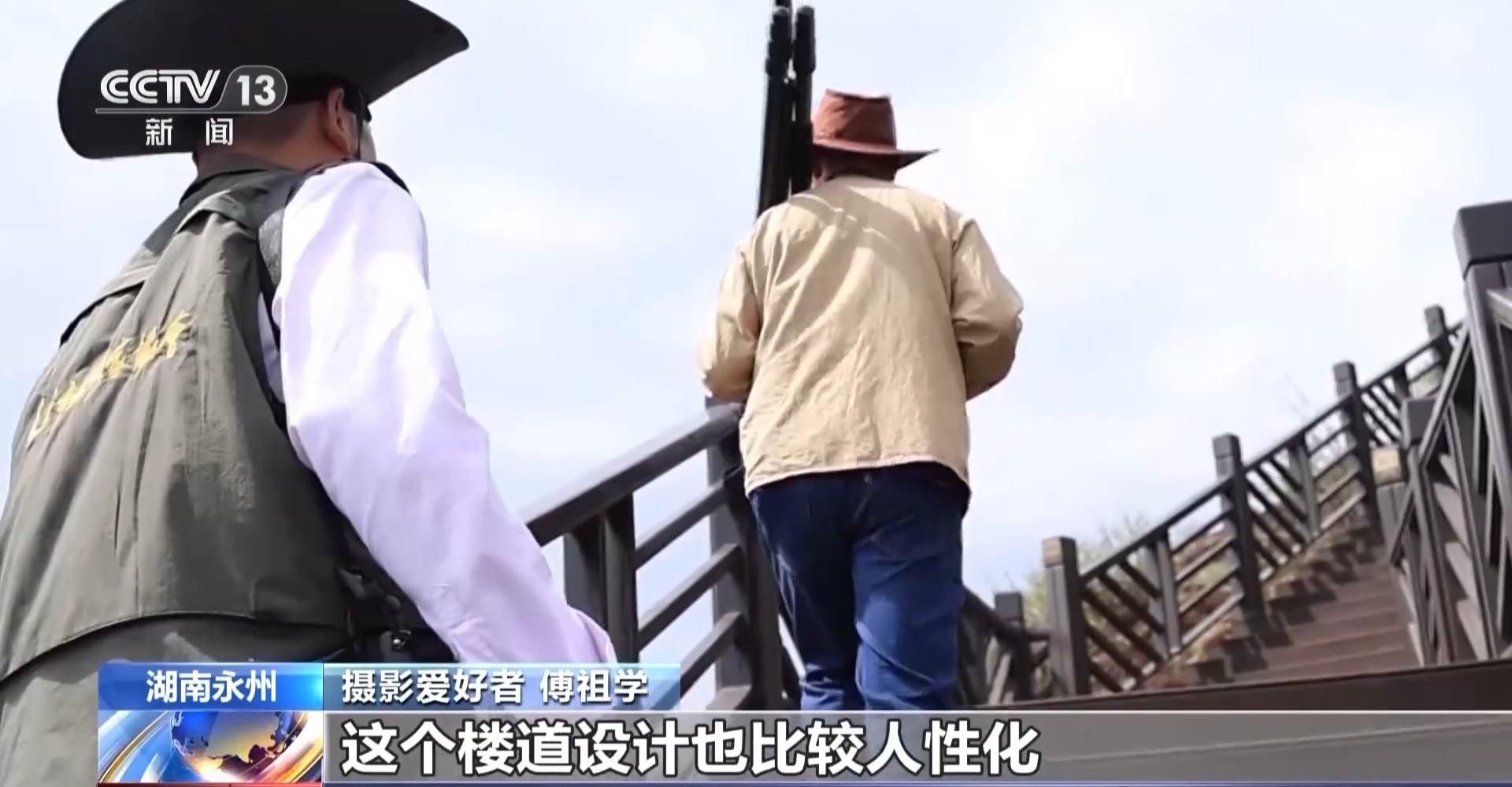 攝影愛好者 傅祖學(xué):我們在觀鳥之余,還可以順著樓道爬到山頂看風(fēng)景,這個樓道設(shè)計也比較人性化,每隔幾十米就有一個休憩的平臺,爬累了就休息一會兒。
