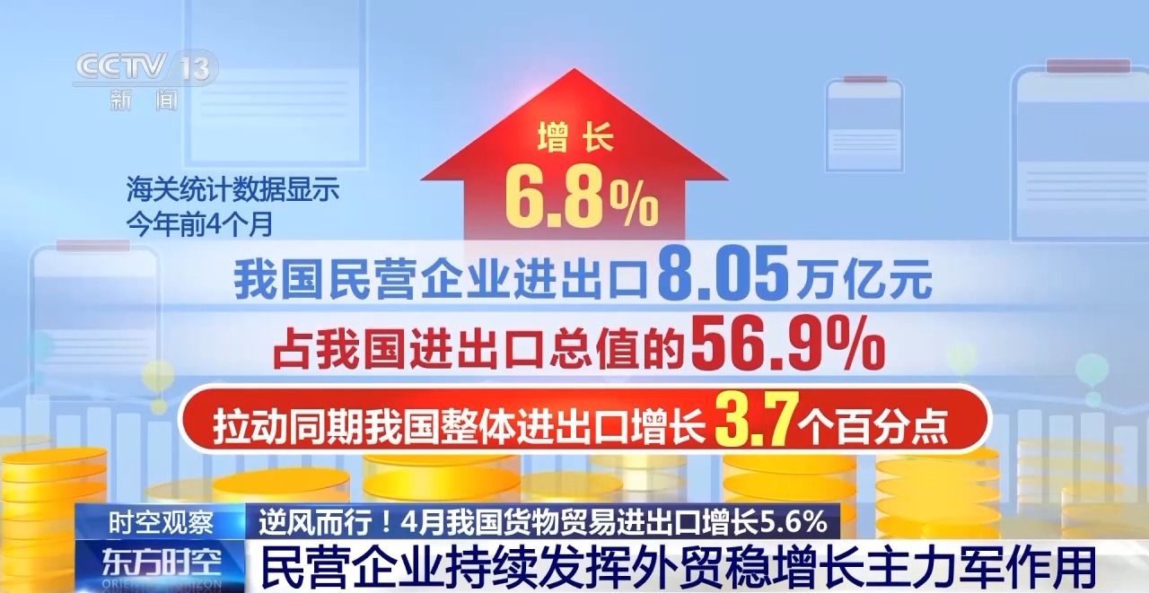 海關總署統(tǒng)計分析司司長 呂大良:今年以來,各項促進民營經(jīng)濟發(fā)展的政策措施協(xié)同發(fā)力,參與外貿(mào)的民營企業(yè)數(shù)量穩(wěn)定增加。前4個月,有進出口實績的民營企業(yè)達49.2萬家,增加8.2%,占我國有進出口實際企業(yè)數(shù)量的86.5%。