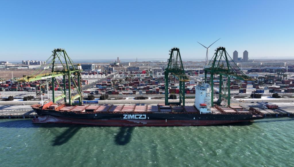 2023年12月21日,“羅安達(dá)輪”集裝箱船靠泊在天津港(無(wú)人機(jī)照片)。當(dāng)日,“羅安達(dá)輪”集裝箱船正式從天津港出發(fā),駛向哥倫比亞、厄瓜多爾、秘魯、智利等南美洲國(guó)家,標(biāo)志著天津港正式開(kāi)通天津—南美西新航線。新華社記者 趙子碩 攝