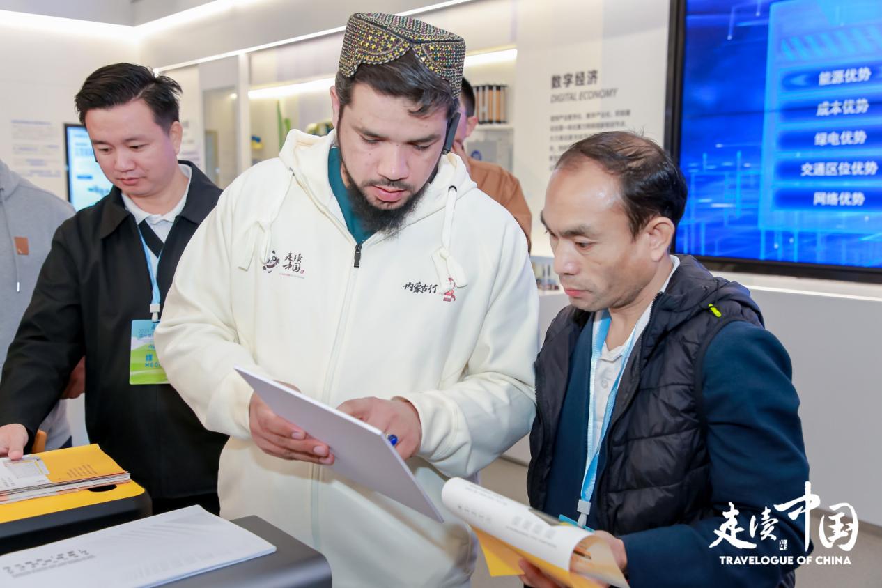 《喀布爾時報(bào)》總編尼克馬爾(中)在烏蘭察布(京蒙)人才科創(chuàng)園展廳仔細(xì)了解相關(guān)介紹
