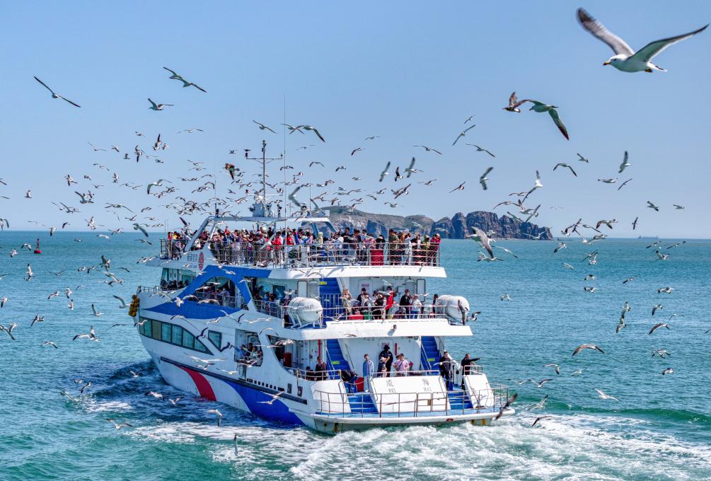 5月4日,在山東省榮成市海驢島海域,游客乘坐海驢島環(huán)島游專線與黑尾鷗互動(dòng)(無人機(jī)照片)。新華社發(fā)(李信君 攝)