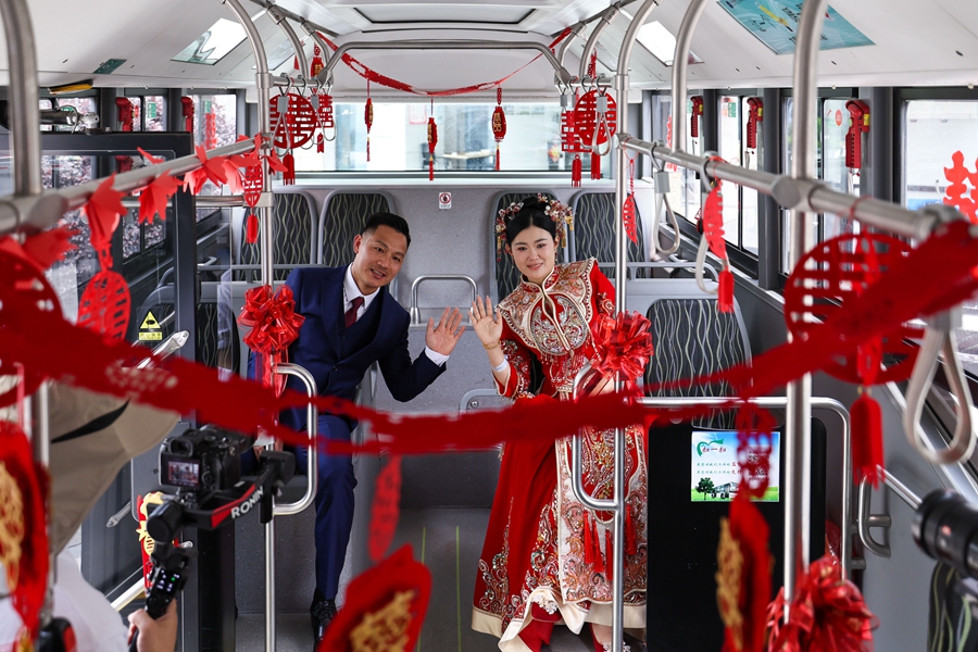 2025年4月30日,“愛情巴士”搭載著新郎新娘前往浙江諸暨市同山鎮(zhèn)唐仁村祠堂進行婚禮儀式。新華社記者 江漢 攝