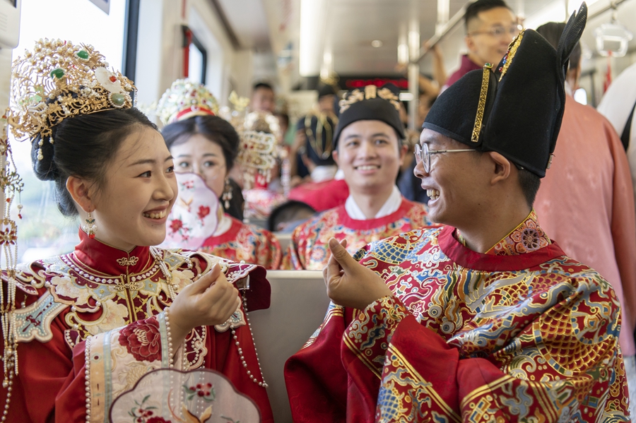2024年8月10日,新人參加由浙江省金華市民政局與金華市軌道交通集團有限公司聯(lián)合舉辦的“緣起金軌、愛在七夕”集體婚禮。新華社發(fā)(胡肖飛攝)