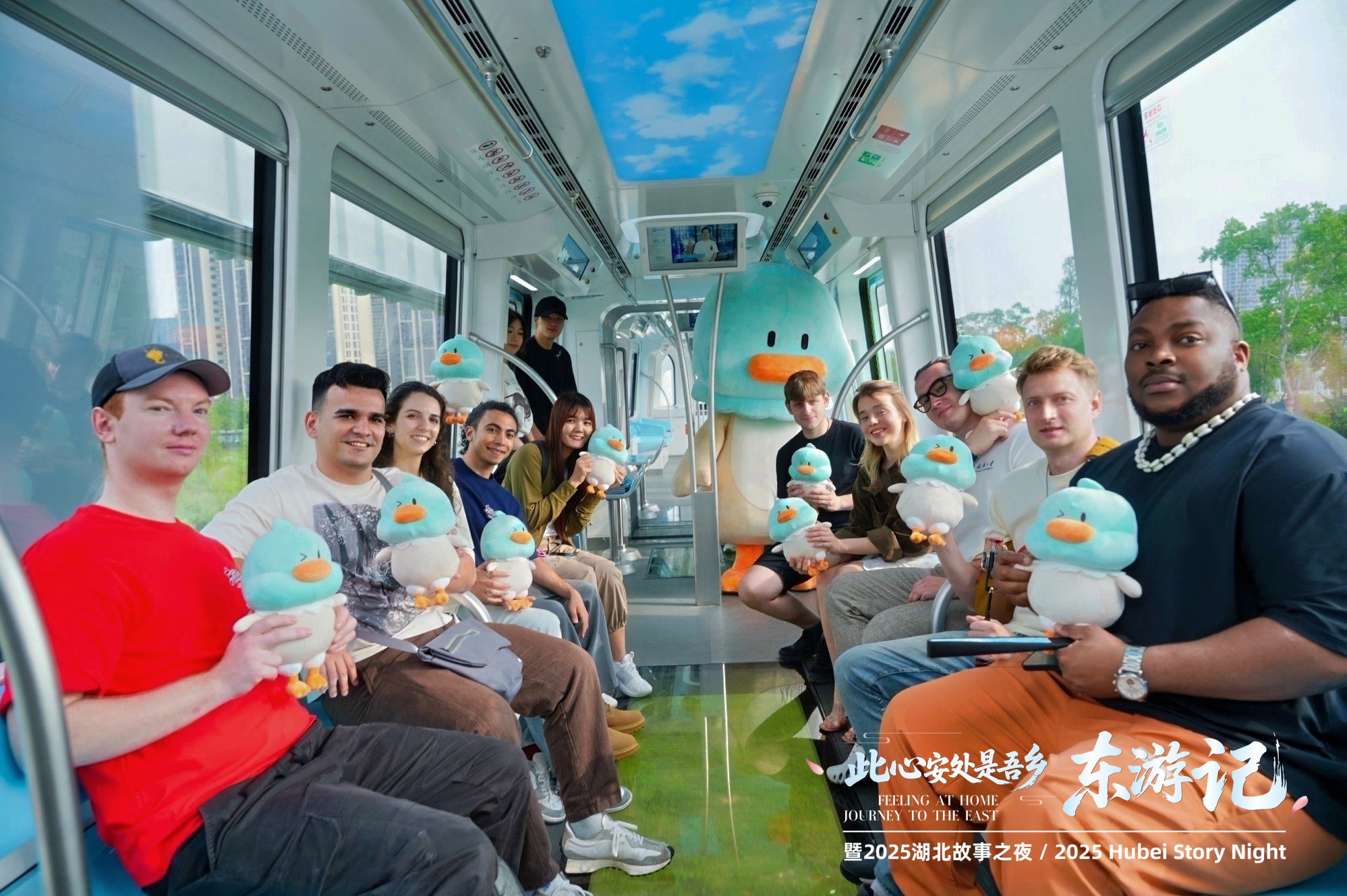 武漢新晉網(wǎng)紅打卡地怎么少得了光谷空軌,在吉祥物青青鴨的帶領(lǐng)下,體驗官們踏上了空中交通之旅。270°全景視窗將城市天際線變成流動畫卷,無人駕駛系統(tǒng)在空中穿行如科幻大片。這種新奇的乘車體驗引得大家連連贊嘆,俄羅斯留學(xué)生可欣興奮的說,“我感覺自己飛起來了,像鳥一樣飄在空中?!?/p>
