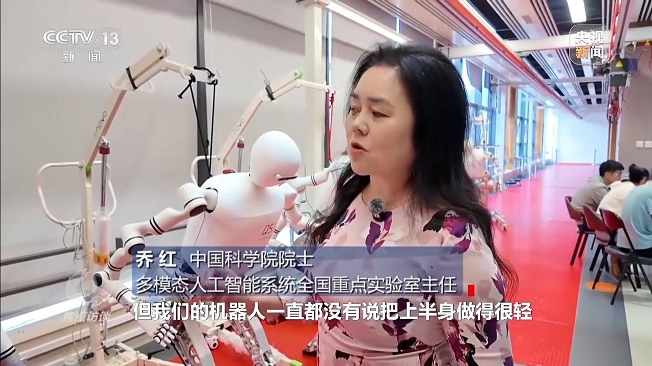 中國科學(xué)院院士、多模態(tài)人工智能系統(tǒng)全國重點實驗室主任 喬紅:人形機器人都是自由度(關(guān)節(jié))比較多,但我們的機器人一直都沒有把上半身做得很輕,因為它是要作業(yè)的、干活的,所以沒有專門追逐要跑得快,跑得快也是我們的期望,現(xiàn)在也能跑2.2米每秒。