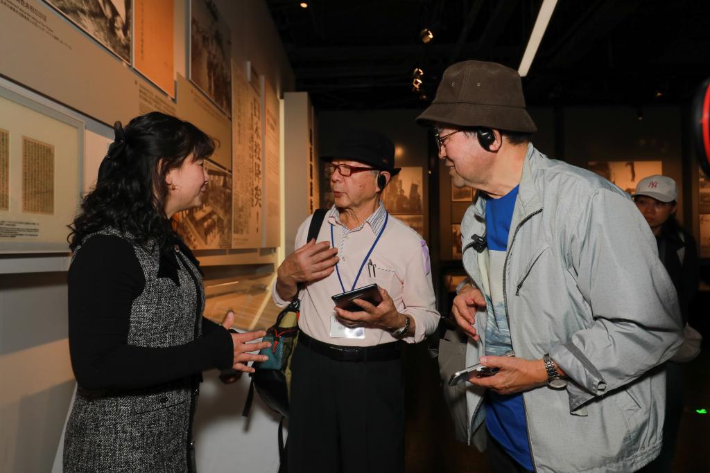 ↑2025年3月26日,夏淑琴的外孫女夏媛(左一)在侵華日軍南京大屠殺遇難同胞紀(jì)念館給日本“紫金草合唱團(tuán)”成員講解。新華社發(fā)