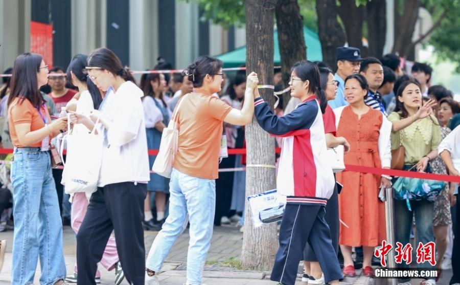 資料圖:2024年6月7日,湖北省武漢市長虹中學(xué)考點,考生入場前與送考老師擊掌。張暢 攝