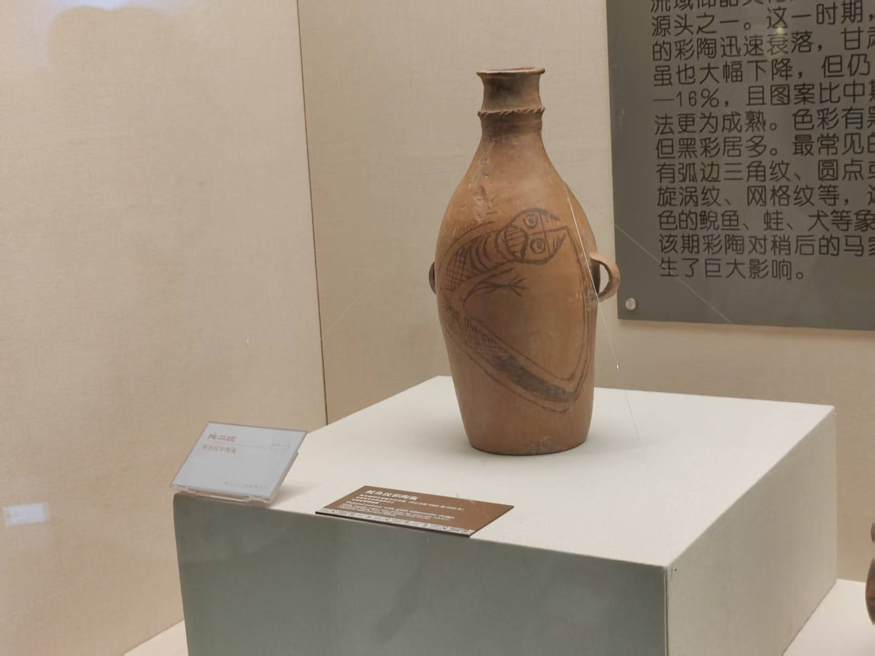 在“彩陶之鄉(xiāng)”主題展區(qū),仰韶文化鯢魚紋彩陶瓶成為焦點。這件距今5500年的陶瓶,腹部繪有人面鯢魚紋,被認(rèn)為是早期“龍圖騰”的雛形?!八赡苁欠诵蜗蟮某橄蟊磉_(dá),印證了甘肅作為中華文明重要發(fā)源地之一?!敝v解員介紹。作為甘肅唯一一件彩陶類國寶,其神秘圖案引發(fā)了采訪團對史前先民精神世界的無限遐想。