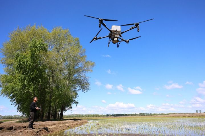 2025年5月21日,在北大荒集團黑龍江綏濱農(nóng)場有限公司東井管理區(qū),操作員操控搭載北斗導(dǎo)航系統(tǒng)的植保無人機,對即將施返青肥的地塊進(jìn)行打點。新華社發(fā)(李興攝)