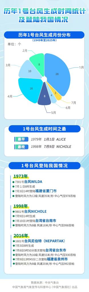 氣象上通常將當(dāng)年西北太平洋及南海生成的首個(gè)編號(hào)臺(tái)風(fēng)稱(chēng)為“初臺(tái)”。統(tǒng)計(jì)顯示,每年1號(hào)臺(tái)風(fēng)生成的時(shí)間分散在1月至7月。1979年的“初臺(tái)”在元旦當(dāng)天就生成了,而1998年的“初臺(tái)”則直到7月9日才出現(xiàn)。常年平均“初臺(tái)”生成時(shí)間為3月25日,從這個(gè)角度看,今年第一個(gè)臺(tái)風(fēng)有點(diǎn)姍姍來(lái)遲了。
