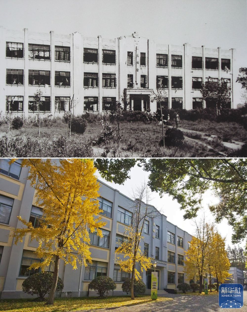 上圖是上海龍華集中營的E棟大樓;下圖是上海中學校園內(nèi)的先棉堂,曾經(jīng)的E棟大樓(資料照片)。新華社發(fā)(上海中學供圖)