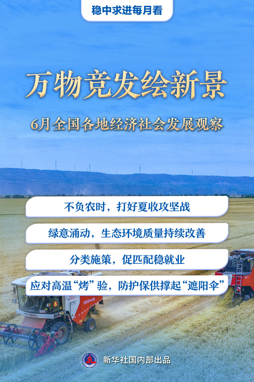 6月仲夏,萬物豐茂。廣袤農田上,“三夏”生產進入關鍵階段;綠水青山間,低碳發(fā)展不斷繪就新圖景;全力穩(wěn)就業(yè),政府、企業(yè)與高校同頻共振;高溫“烤”驗下,做好各項保障工作……上半年收官之月,各地各部門統(tǒng)籌推進穩(wěn)增長、促改革、惠民生舉措,推動經濟社會沿著高質量發(fā)展之路穩(wěn)步前行。