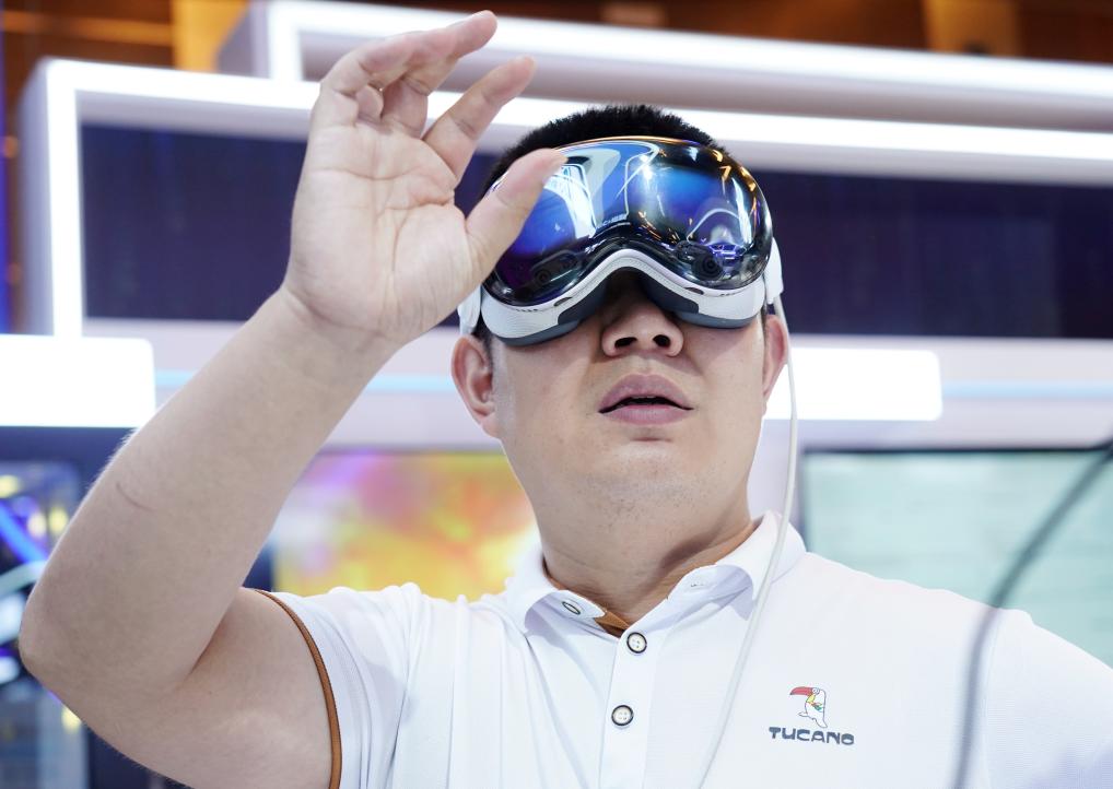 7月2日,參觀(guān)者在2025全球數(shù)字經(jīng)濟(jì)大會(huì)數(shù)字經(jīng)濟(jì)國(guó)際交流合作體驗(yàn)區(qū)體驗(yàn)一款MR混合現(xiàn)實(shí)設(shè)備。新華社記者 張晨霖 攝